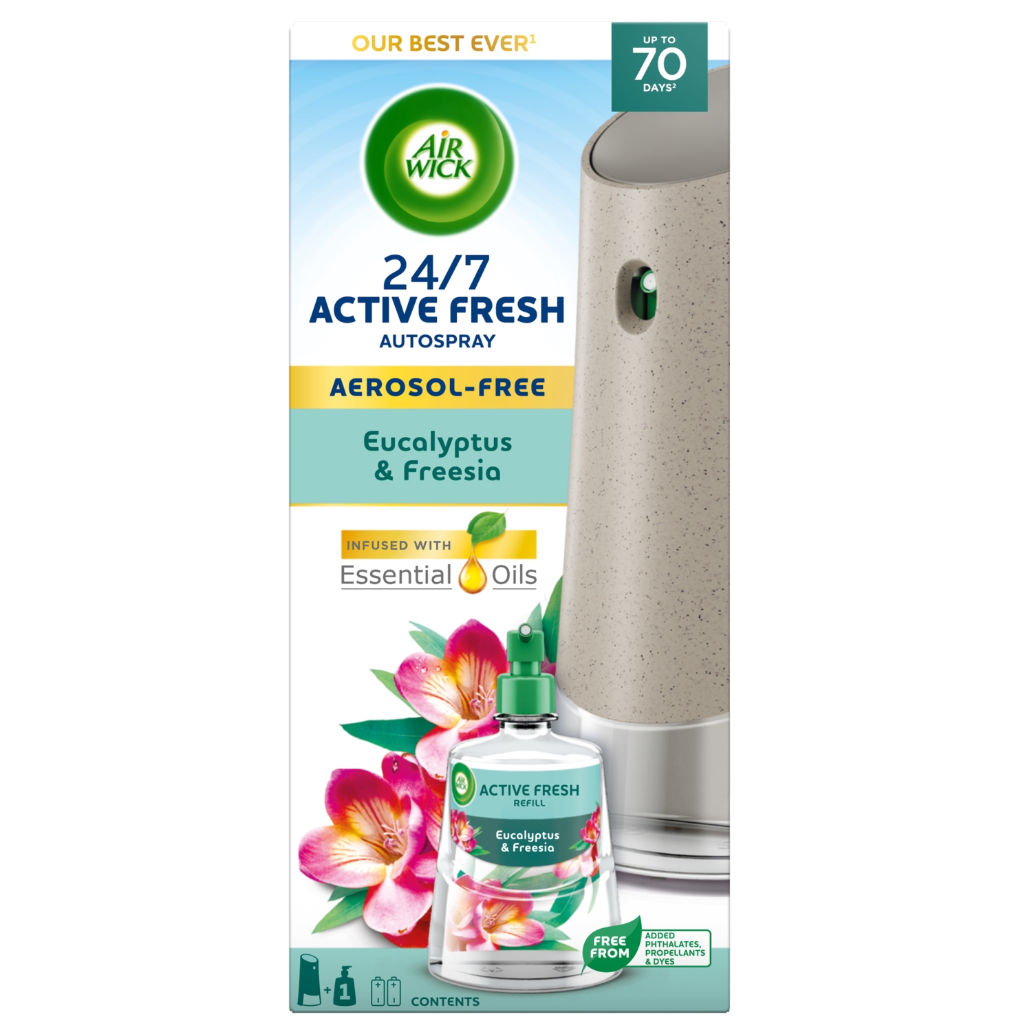 Air Wick 24/7 Active Fresh is Air Wick’s first aerosol-free and best ever automatic air freshener. Our latest odour neutraliser is infused with natural essential oils for long lasting fragrance to banish tough odours for up to 70 days. Tackle dog, bathroom and kitchen smells with your choice of 3x intensity settings, plus an instant action boost button. Ensure you place your 24/7 Active Fresh above 6ft for an optimum performance and room fill. Air Wick is a proud partner of WWK UK, working to restore UK wildflower habitats. Air Wick is raising £400,000 per year for WWF-UK for wildflowers conservation projects (WWF-UK Trading Ltd pays all taxable profits to WWF-UK charity registered in England and Wales 1081247, Scotland