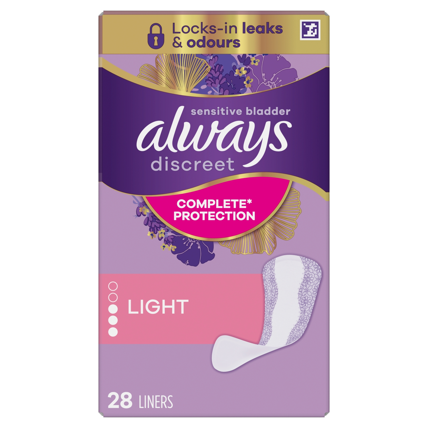 Always Discreet Liner Light panty liners are ultra-thin and flexible for discreet, everyday protection against occasional light bladder leaks, such as those caused by coughing or sneezing. They are designed to provide freshness and confidence without the bulk of a full pad.
