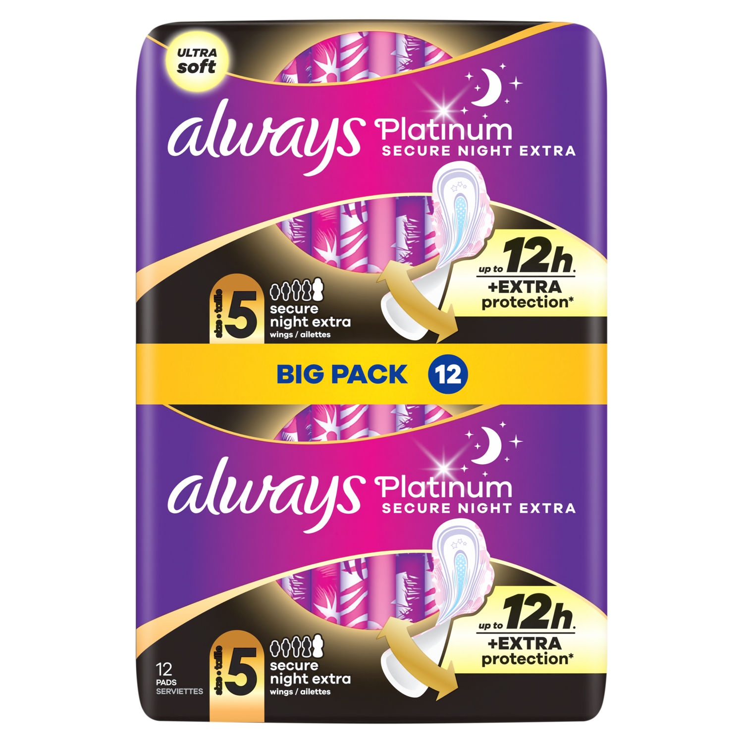 Always Platinum Secure Night Extra Size 5 sanitary towels are designed for maximum overnight protection against heavy menstrual flow, offering up to 100% leak protection and enhanced comfort with an 85% wider back. This pack contains 12 pads