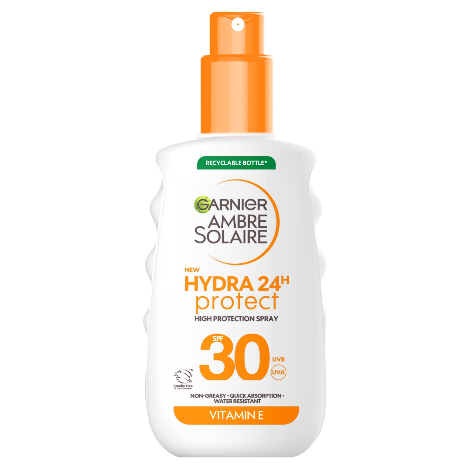 The Garnier Ambre Solaire Hydra Protect Spray SPF 30 150ml provides high, broad-spectrum UVA/UVB protection and 24-hour hydration in a water-resistant, non-greasy spray formula.