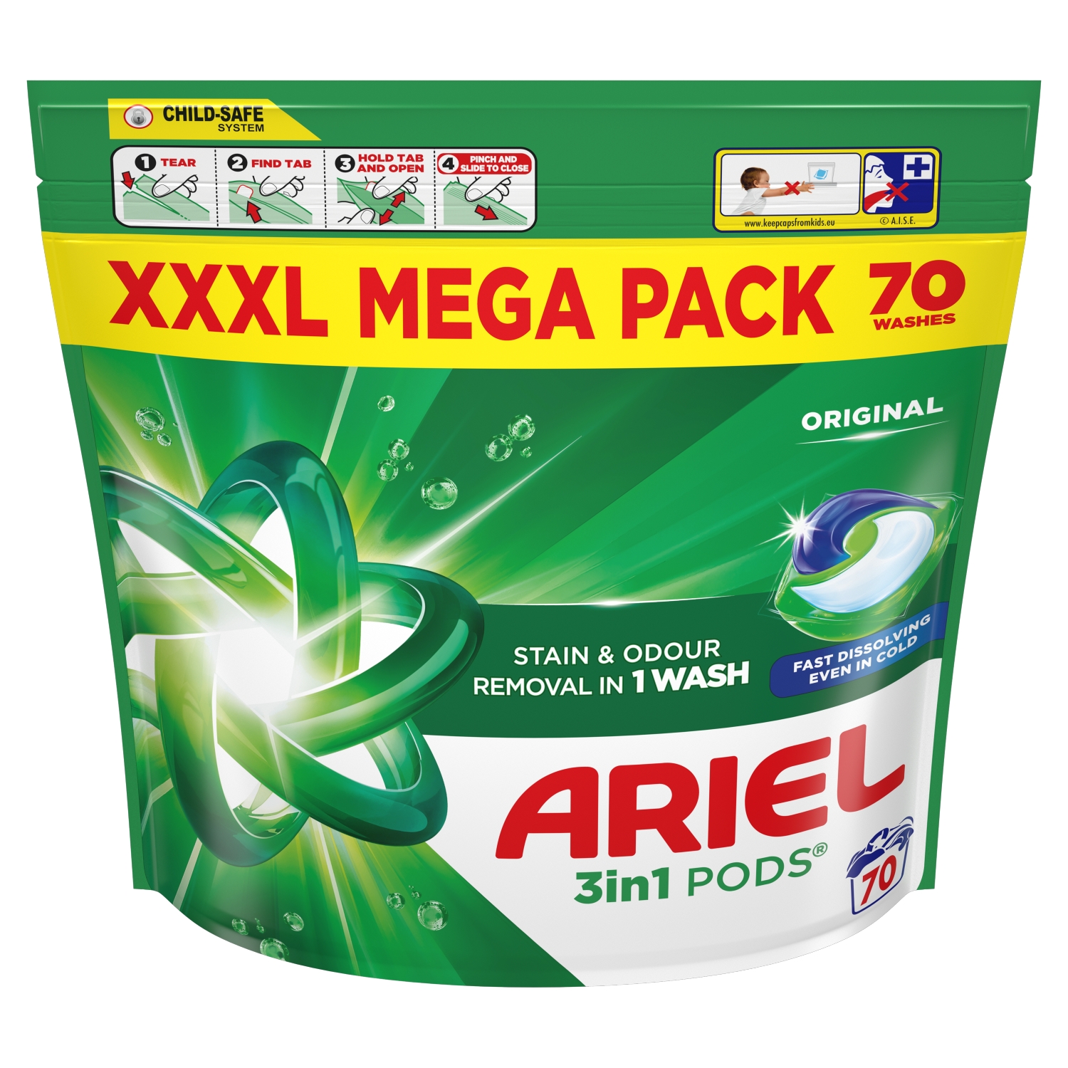 Ariel Laundry Detergent Liquid Pods (70 Washes) are all-in-one capsules designed to provide outstanding cleaning performance, effective stain and odor removal, and fabric protection in one convenient, pre-measured dose.
