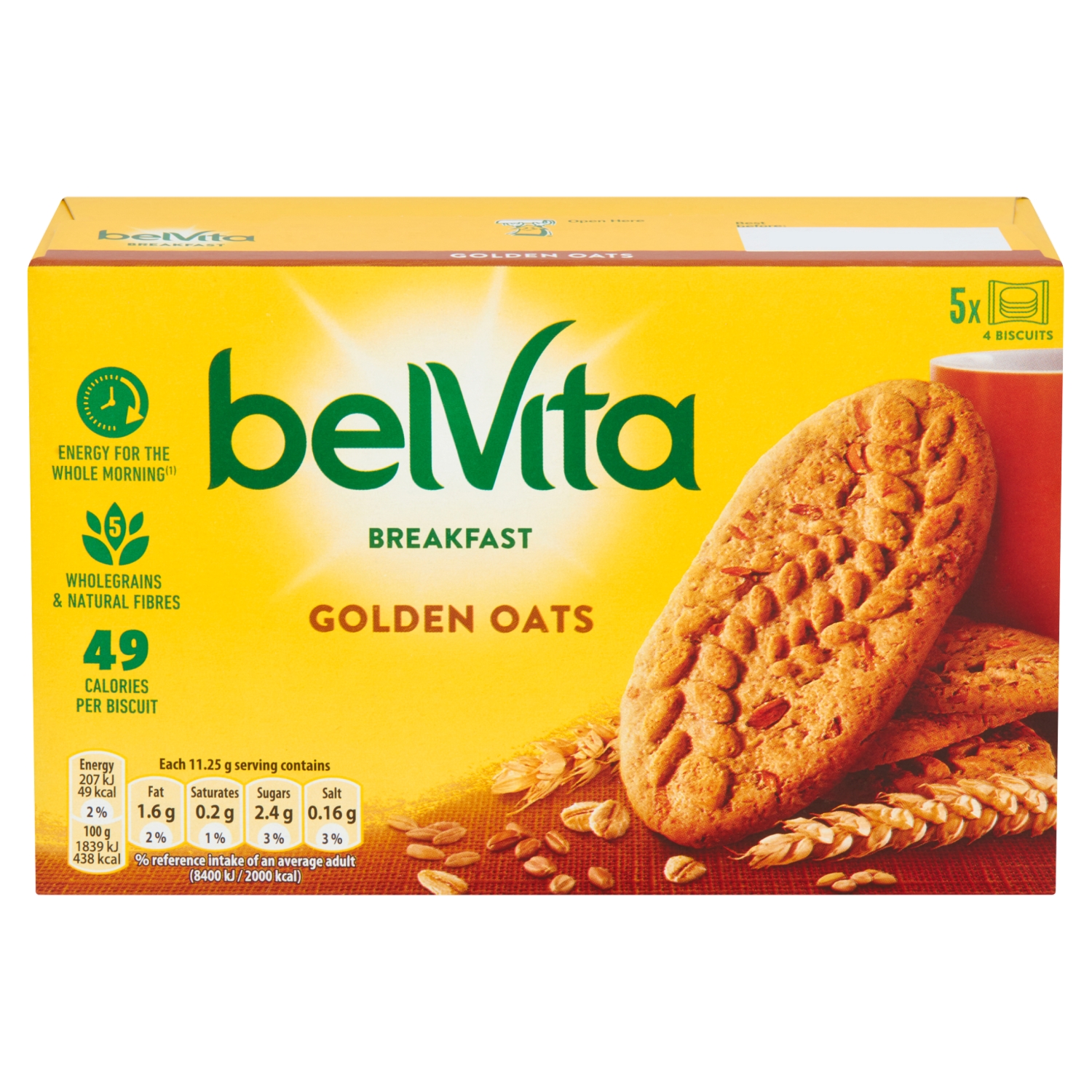The Belvita Breakfast Golden Oats 5 Pack 225g provides five individually wrapped packs of crunchy wholegrain biscuits that offer a steady source of energy for the morning.