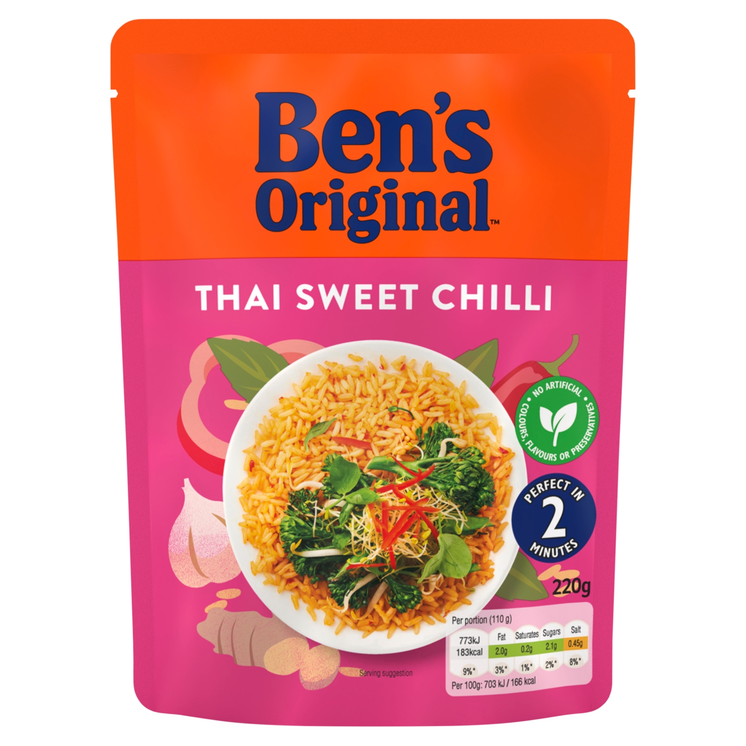 The Ben’s Original Thai Sweet Chilli Microwave Rice 220g is a convenient, pre-steamed parboiled long grain rice dish flavored with red peppers, chillies, garlic, and ginger, which is ready to eat in just two minutes. It provides an authentic Thai taste and is suitable for vegetarians, with no artificial colours, flavours, or preservatives.