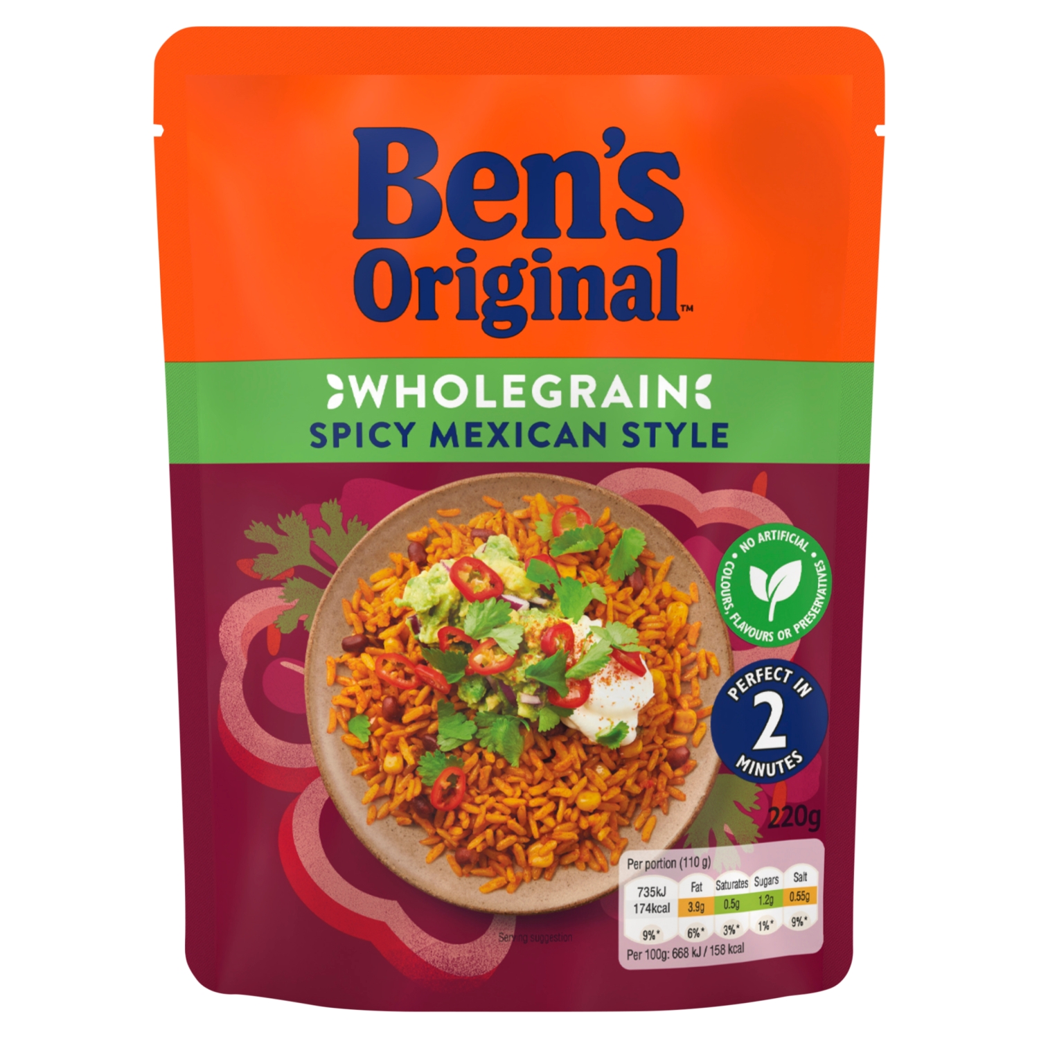 Ben’s Original Wholegrain Spicy Mexican Style Microwave Rice 220g is a convenient, pre-steamed wholegrain brown rice dish with a hearty, spicy flavour profile from beans, corn, and peppers, ready to eat in just two minutes. It is suitable for vegetarians and contains no artificial colours, flavours, or preservatives.