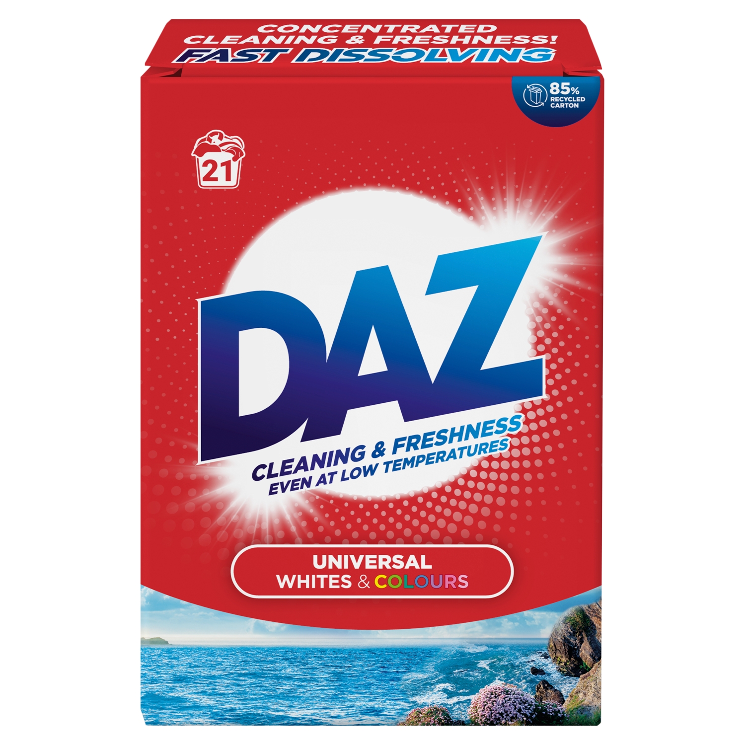 Daz Powder For Whites & Colours (1.05kg, 21 Washes) is a biological washing powder designed to deliver a “dazzling clean” for both white and colored fabrics. It provides effective stain removal and a fresh fragrance for everyday laundry.