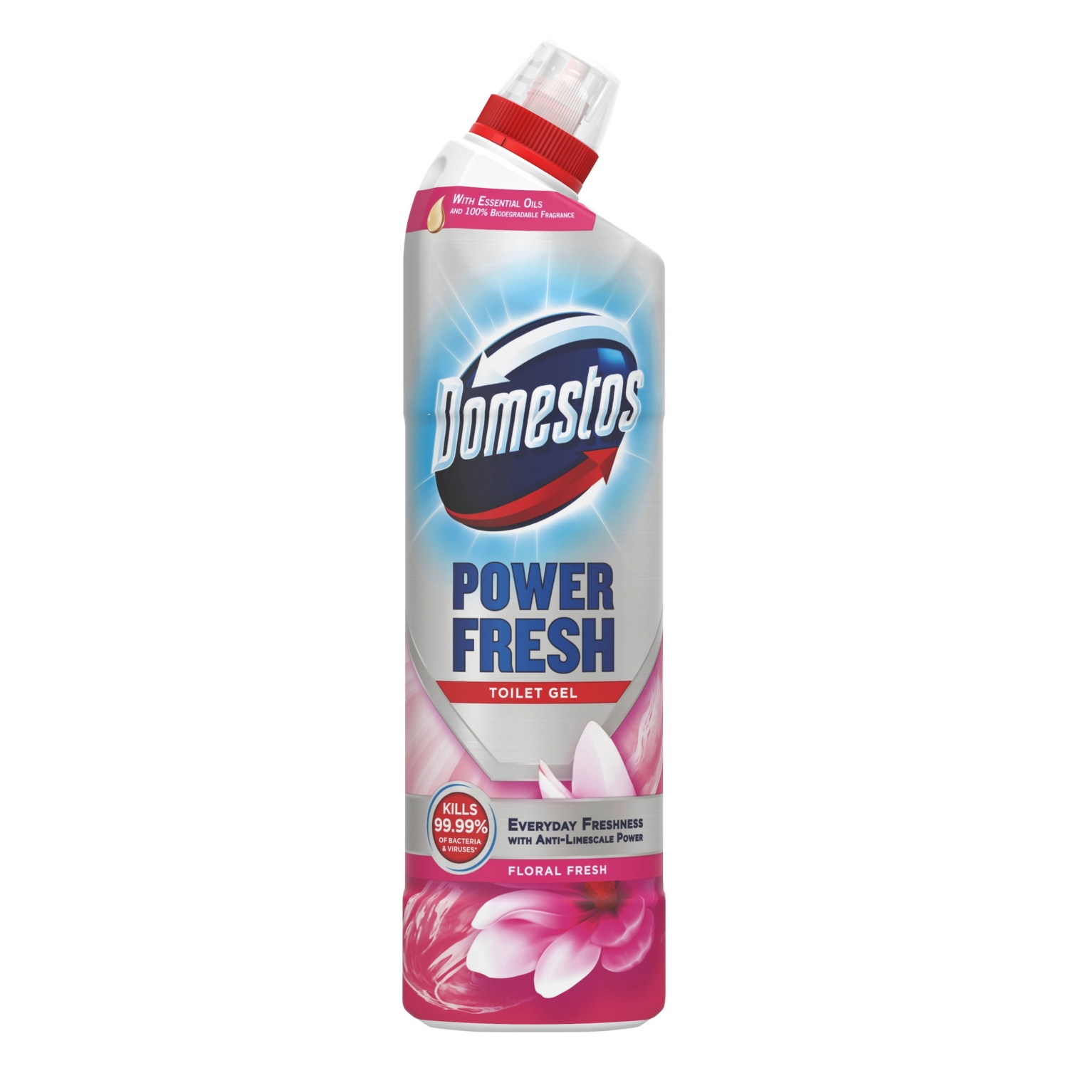 Domestos Power Fresh Toilet Gel Floral Fresh eliminates 99.99% of germs*, leaving your toilet clean and fresh with a long-lasting floral scent. This toilet cleaner features essential oils and a 100% bio-degradable fragrance, so there will be no harsh smells left behind. While working to clean stains from your toilet bowl, it grips below the waterline to remove stubborn limescale that can build up over time, leaving your toilet disinfected, fresh-scented, and sparkling clean. Pair this limescale remover with Domestos Power 5 toilet blocks for lasting freshness with every flush. How to use: To open the child-resistant cap, squeeze pads on the sides of the cap and turn anti-clockwise. Unscrew the cap and squirt the gel evenly under the rim; leave to work, flush and use the brush as necessary. For disinfection of the toilet and for optimal results against strong deposits and dirt, leave to work for at least 30 minutes. After use, replace cap and turn clockwise until you hear a click. Domestos has been protecting families against germs since 1929. Today, Domestos continues to protect millions of families with its full range of cleaning products, including thick bleach and bleach sprays which can be used as a multi-purpose cleaner all around your home, as a bathroom cleaner, or even as a drain cleaner