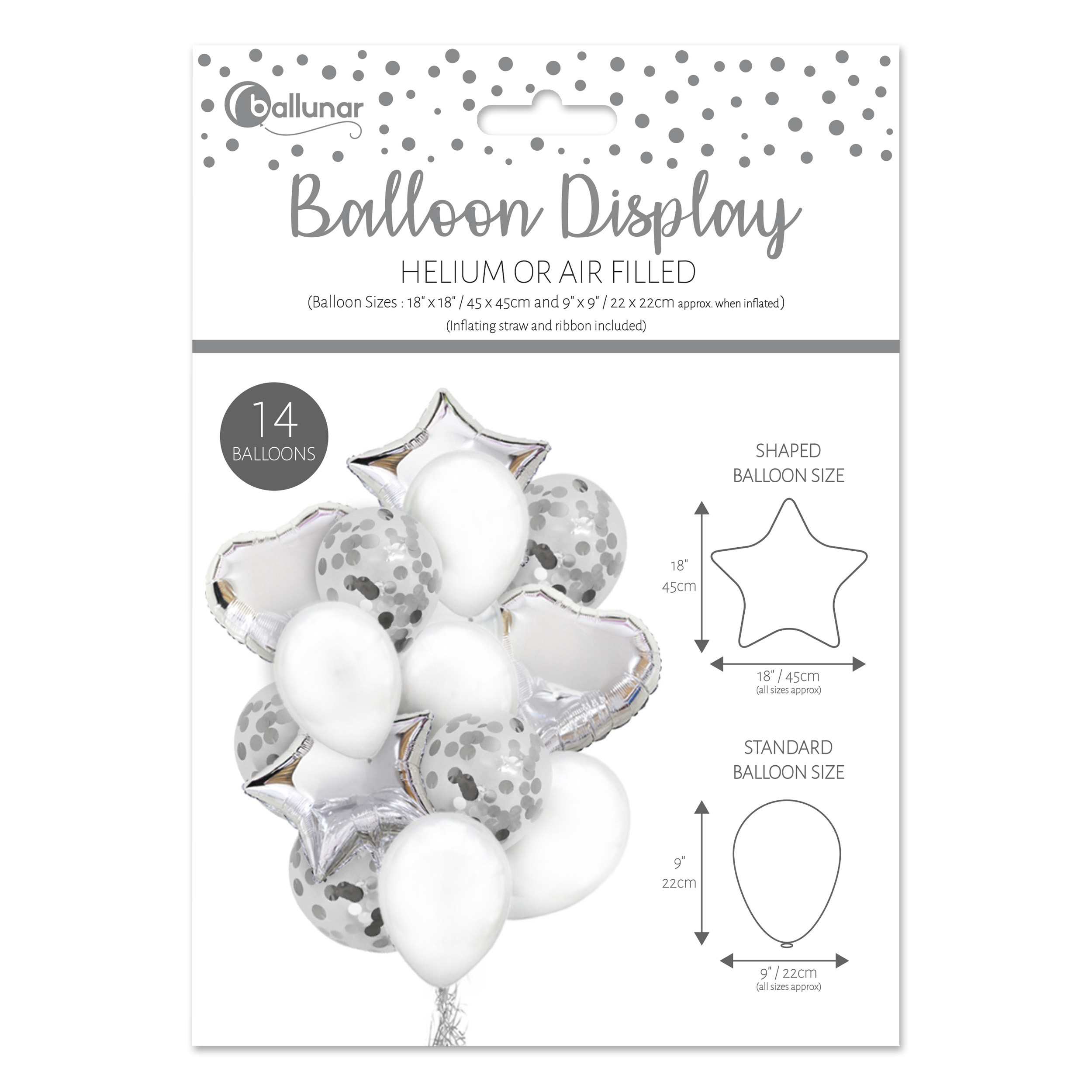 Bring a touch of sparkle to any celebration with this 14-piece silver balloon set. Each balloon measures approximately 45 x 45 cm, perfect for birthdays, anniversaries, weddings, or festive parties. Made from high-quality, durable material, these balloons are easy to inflate and create an elegant, shimmering décor for any special occasion.