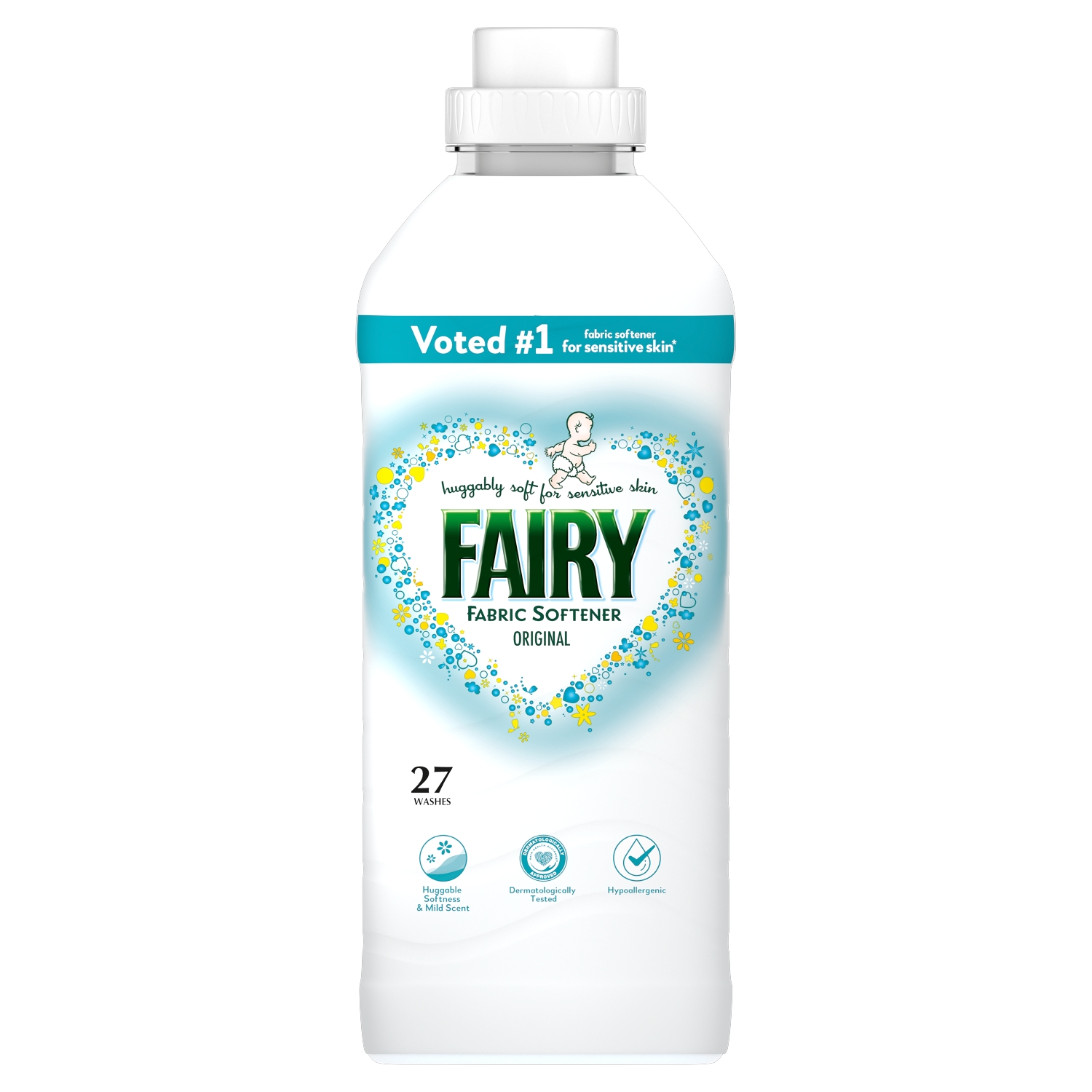 Fairy Fabric Conditioner (891ml, 27 Washes) is a hypoallergenic and dermatologically tested fabric softener, specifically designed for sensitive skin, that provides luxurious softness and a mild, fresh scent to laundry.
