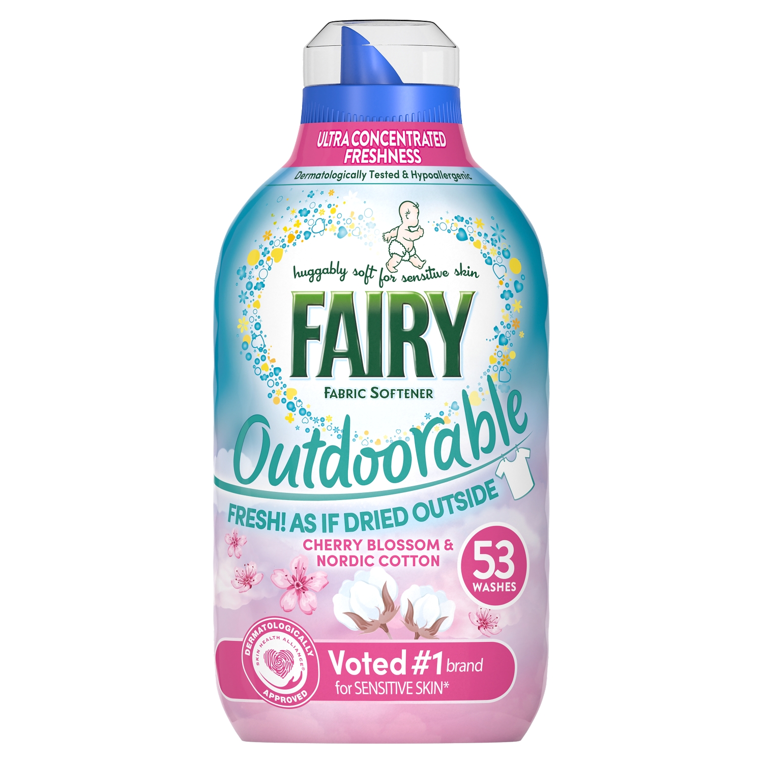 Fairy Fabric Conditioner (often branded as “Outdoorable”) in the Cherry Blossom & Nordic Cotton scent (742ml, approximately 21 washes) is an ultra-concentrated fabric softener designed for sensitive skin, offering a fresh, line-dried scent even when clothes are dried indoors.