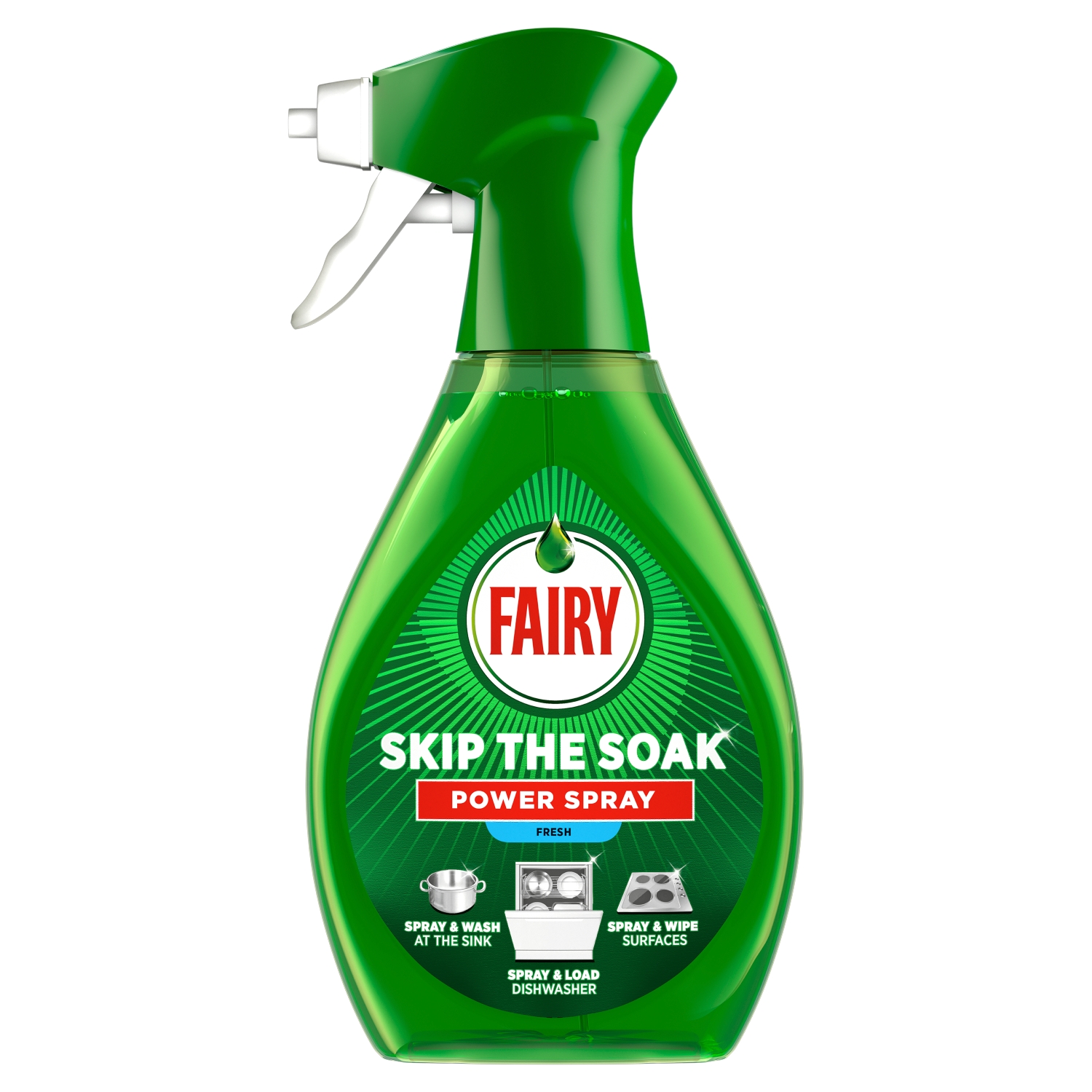 SKIP THE SOAK WITH FAIRY POWER SPRAY! Tired of soaking and scrubbing the dishes? Say goodbye to hours of soaking dishes to get rid of grease with Fairy Skip the Soak Power Spray. Designed to ease washing dishes with tough grease, without water, for fast & effortless impeccable clean. With it’s formula effective on 100% grease, it gives you the power of an overnight soak in minutes! Just scrape off excess food and spray directly to dishes before placing them in the dishwasher or directly in the dishwasher, or washing them by hand. It is uniquely formulated to make pre-treating dishes easy, fast, and effortless, whether before loading them to dishwasher with your regular dishwashing tablets or washing by hand with your regular washing up liquid. For everyday messes, simply spray the suds on and wipe—no water needed until rinsing. For very tough messes, let the suds sit for a few minutes before wiping to get optimal results. Plus you can also use it across your kitchen, by spraying and wiping the sink and kitchen surfaces for a quick clean. Spray and wipe with a damp cloth. Very glossy surfaces you may want to wipe dry for perfect shine. Fairy Skip the Soak Power Spray, one single solution to tackle tough grease on dishes before dishwasher, before handwashing, and on kitchen surfaces for an effortless impeccable clean and irresistible freshness!