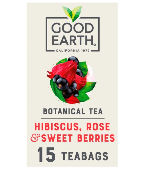 The Good Earth Herbal Tea Hibiscus Rose & Sweet Berries 15 TeaBags 42g pack contains 15 biodegradable, naturally caffeine-free herbal tea bags, offering a vibrant and luxurious blend of tart hibiscus, succulent red berries, and delicate floral garden rose.