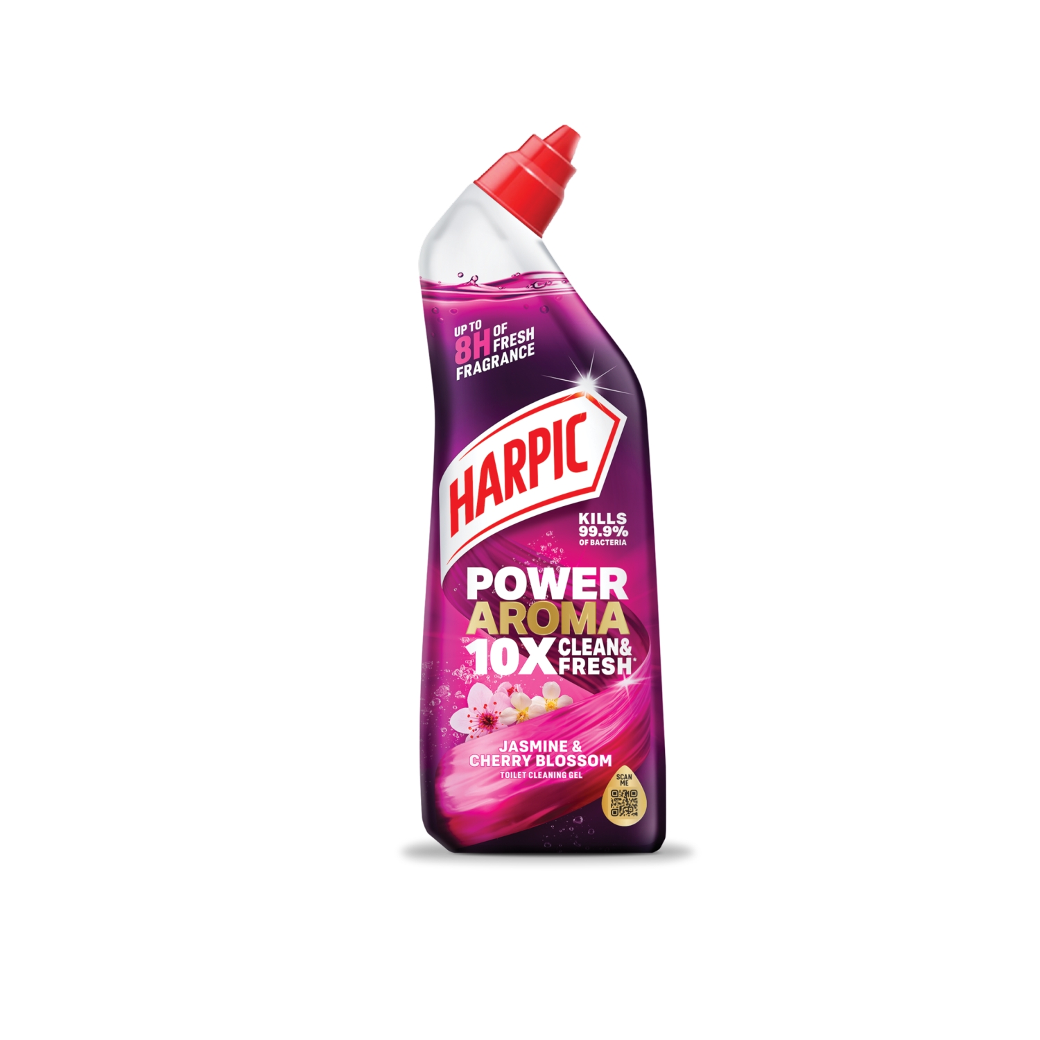 Our unique Power Aroma formula with dual active cleaning system removes tough stains including limescale, prevents build-up and kills 99.9% of bacteria. Enriched with 50% extra fragrance (vs Harpic Active Fresh) and odour fighting technology, it ensures up to 8 hours of fresh fragrance.