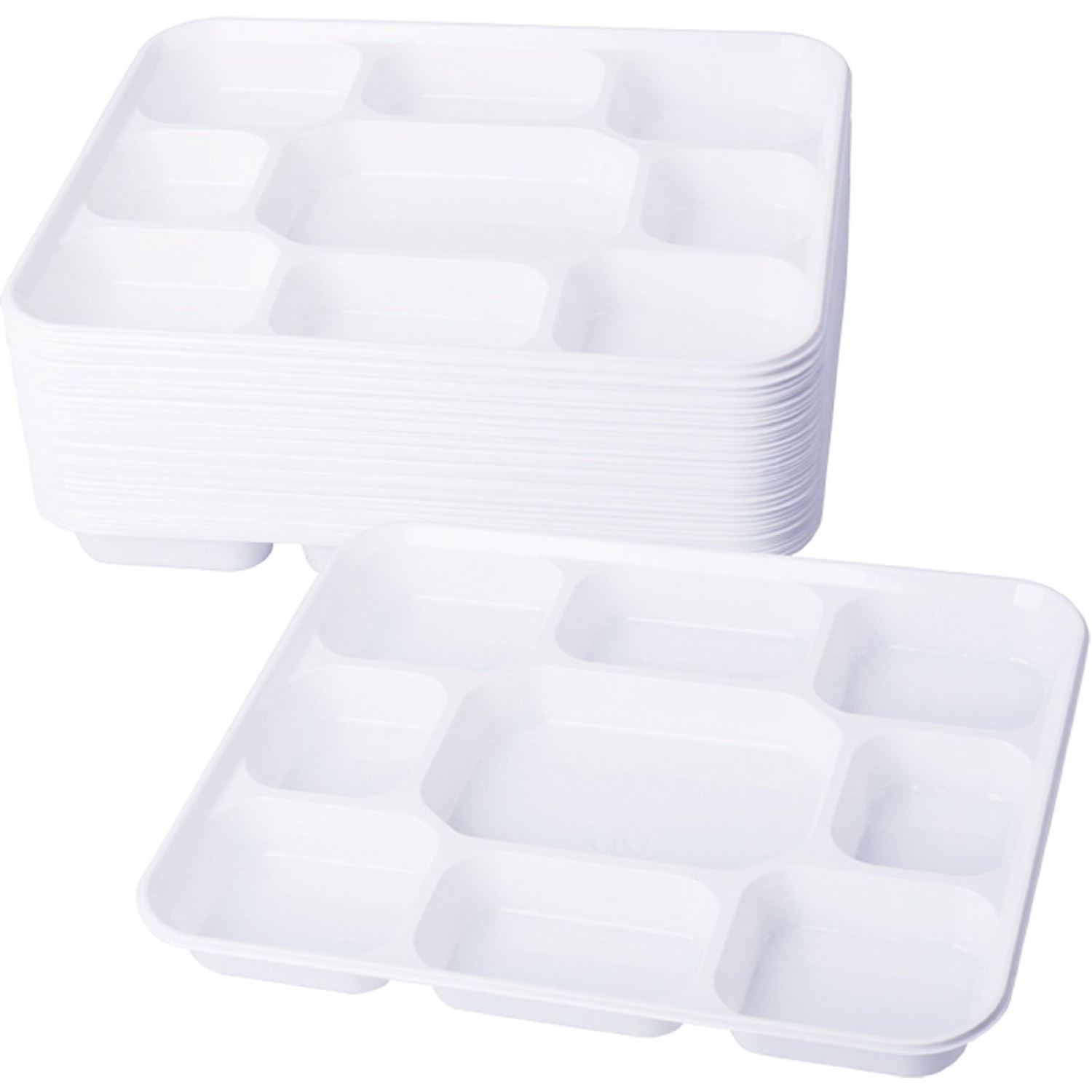 Make serving meals organized and convenient with this 50-piece set of heavy-duty 9-compartment square plastic dinner plates. Designed for portion control and mess-free dining, these plates are perfect for cafeterias, events, and large gatherings.