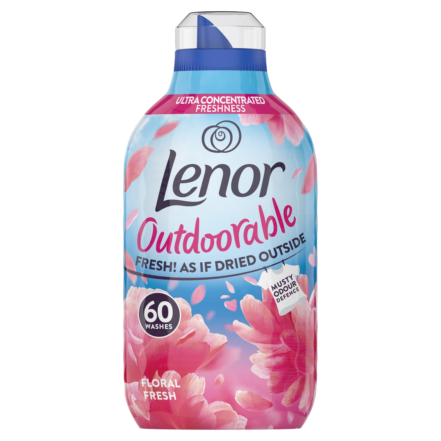 Enjoy freshness as if youve dried your clothes outside, even when you dry inside! Lenor Outdoorable’s ultra-concentrated freshness formula is more concentrated versus other Lenor fabric conditioners, giving you Xx washes in a small bottle. Thanks to its innovative technology, you just need a small dose to get that line dried feeling, whatever the weather! Breathe-in this floral fresh scent! This blend of sweet and comforting notes combined with musty odour protection will provide a long-lasting freshness delight. Recycled plastic bottle excl. cap, spout and sleeve. Lenor Outdoorable was developed together with consumers to recreate the outdoor freshness and it keeps releasing freshness when fabrics are just dried, stored in the cupboard and even when youre moving.