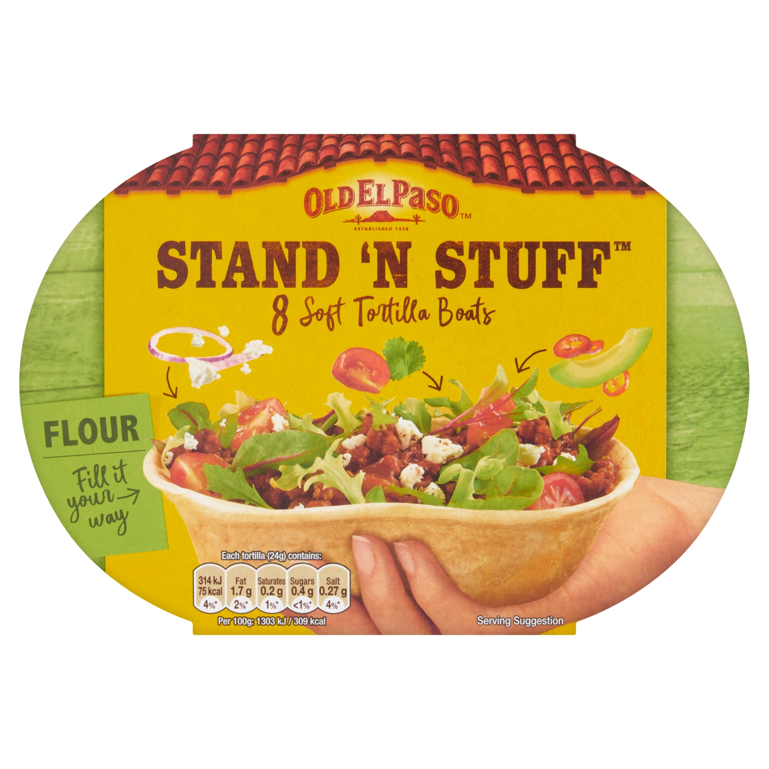 The Old El Paso Stand ‘N’ Stuff Soft Flour Tortillas 193g pack contains 8 uniquely shaped tortillas (also referred to as “tortilla boats”) designed with a flat bottom so they stand up on their own. This design makes them easy to fill with your favorite ingredients, such as minced beef or vegetables, and helps prevent spills during meals.
