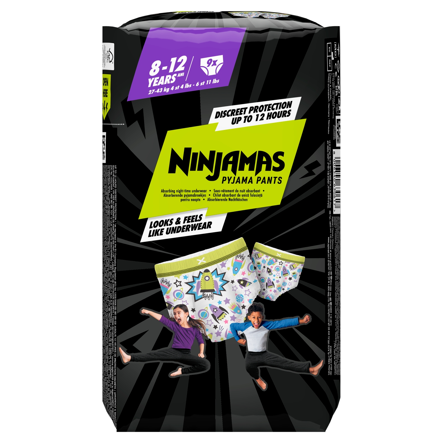 Pamper Ninjamas Pyjamas Pants! Take on bedwetting accidents and wake up confident thanks to all-night leak protection. Ninjamas Instant Absorption Technology absorbs wetness instantly for powerful protection like youve never seen. Their 360° FormFit Belt adapts to your childs waist for a discreet & comfortable underwear-like fit so kids can wake up feeling great each day. Just like you, we put your childs safety first: Pampers Ninjamas Pyjama Pants are dermatologically tested, free of EU perfume allergens (as regulated in the EU Cosmetics Regulation No 1223/2009), and certified by OEKO-TEX Standard 100
