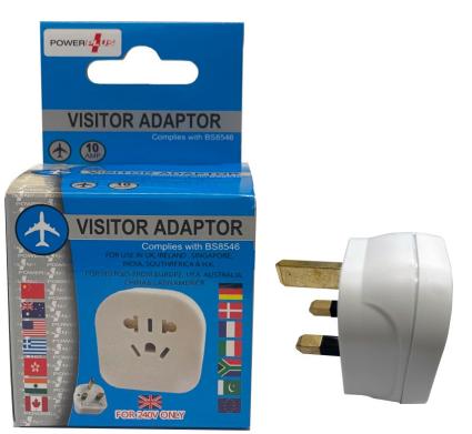 A travel adapter designed to allow compatible visitors plugs to connect with UK-style sockets in suitable travel or accommodation settings. It is useful for tourists, temporary visitors, or international users needing a simple connection solution for low-power compatible devices. Its compact design makes it convenient to carry and use while traveling.