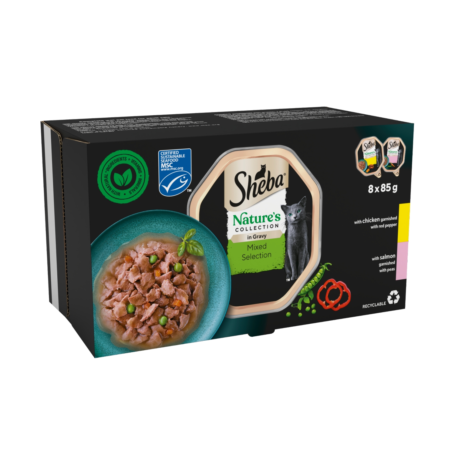 Sheba Nature’s Collection Mixed Selection In Gravy 8 x 85g is a 100% complete and balanced wet food for adult cats, featuring delicious, natural ingredients with visible high-quality meat and fish pieces in a delicate gravy. This multipack offers a variety of flavours to keep meal times interesting.