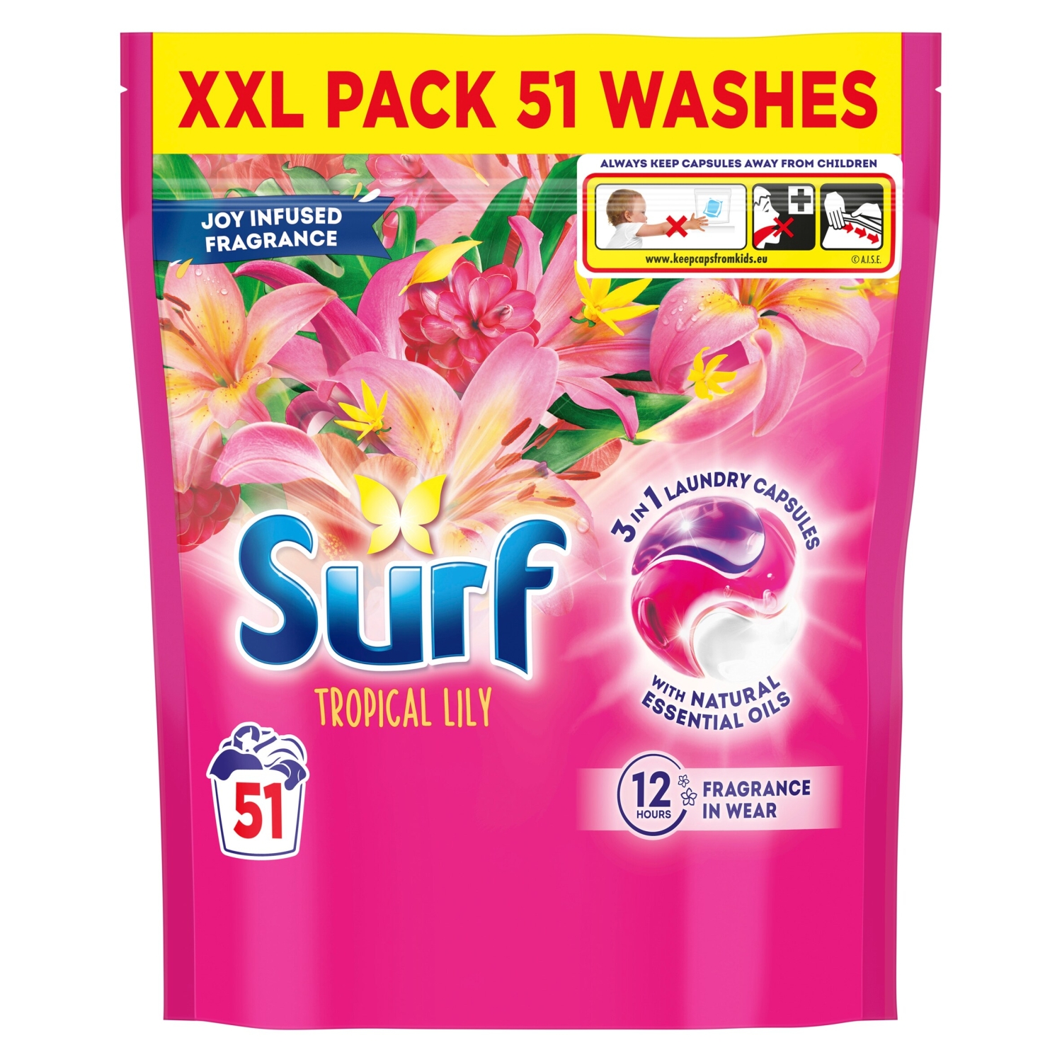 Experience joy-infused fragrance that lasts from dawn to dusk with our best ever Surf Tropical Lily Fragrance. It brings bursts of joy to your day-to-day life, infusing your wardrobe with an explosion of floral sweetness. Its irresistible scent is crafted with natural essential oils, making it your perfect laundry partner for up to 12 hours of in wear delight.