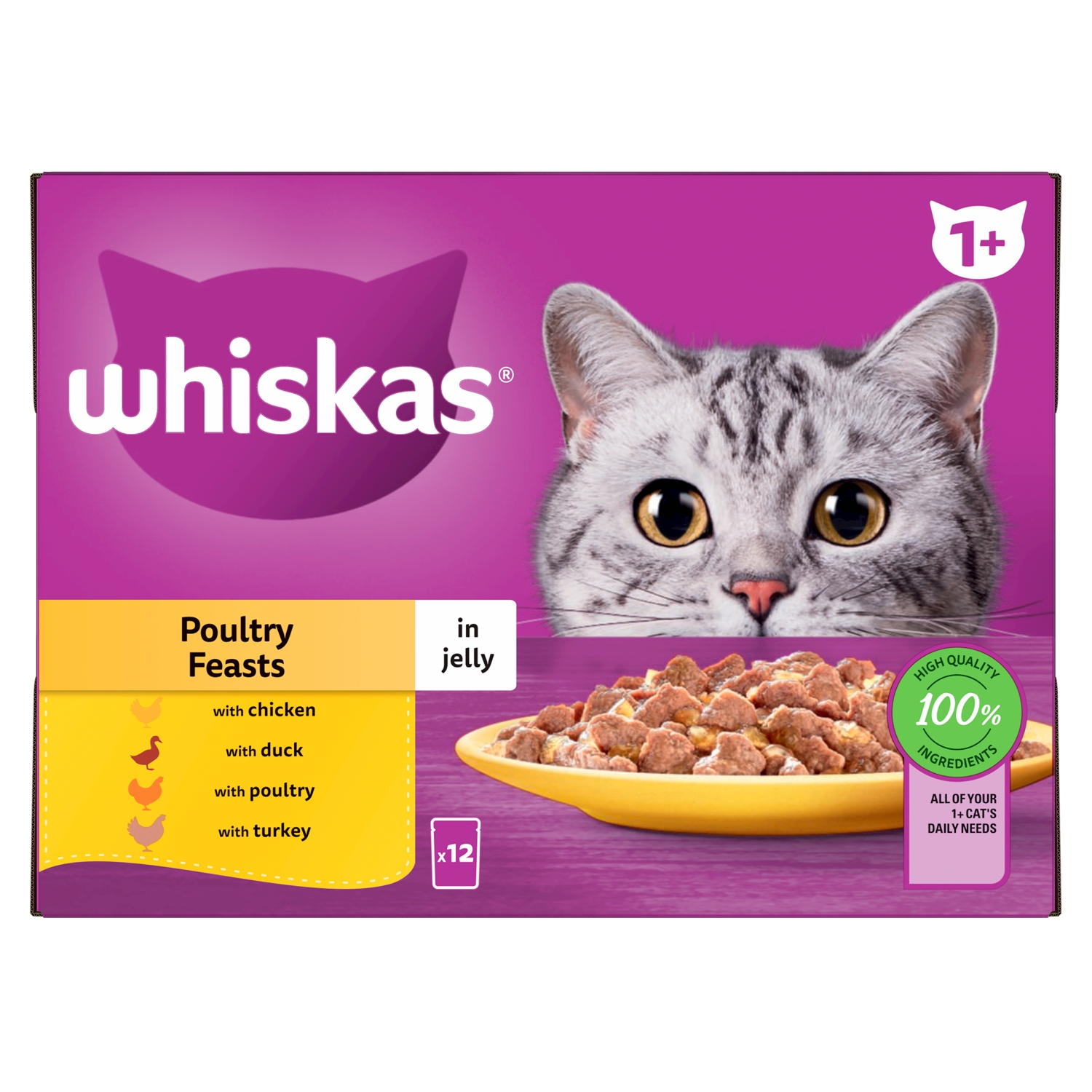 Whiskas 1+ Adult Poultry Feasts In Jelly Pouches 12 x 85g is a 100% complete and balanced wet food for adult cats, providing tender pieces of various poultry flavors in a succulent jelly to meet all their daily nutritional needs. This multipack offers a variety of flavours to keep mealtimes interesting and appealing.
